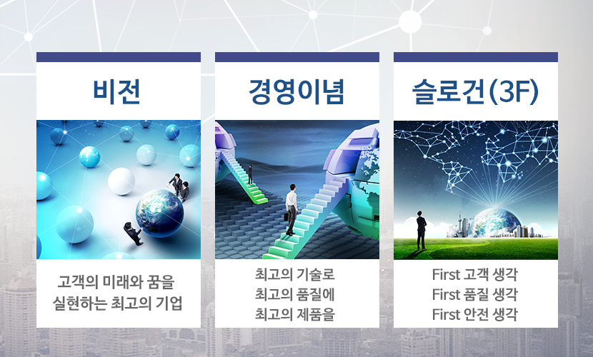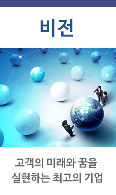 비전 및 경영이념 고객가치 창출을 최우선한다. 고객의 다양한 요구사항의 신속, 정확한 대응 인재를 중시하고 육성한다. 공평한 인재 평가와 장기적인 육성 정도경영과 사회적책임을 다한다. 공정한 경쟁으로 존경 받는 기업이 된다. 그룹 시너지 창출에 기여한다. 회사 전체를 먼저 생각하고 행동 한다.